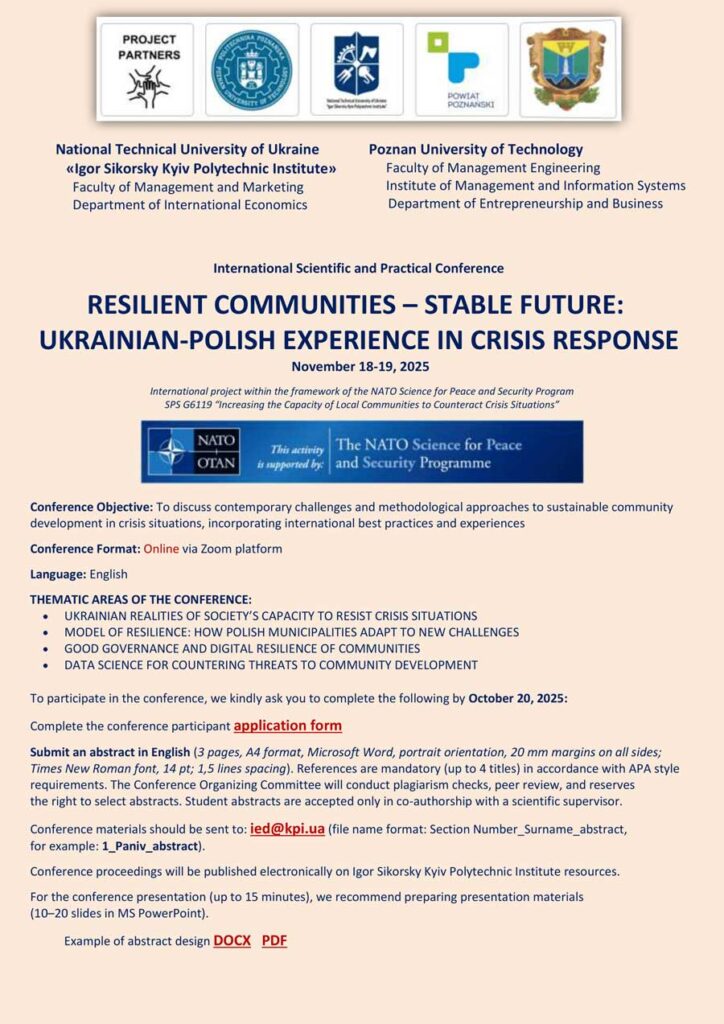 Київський політехнічний інститут імені Ігоря Сікорського спільно з Познанським політехнічним університетом в онлайн-форматі проводить 18-19 листопада 2025 року міжнародну конференцію «Стійкі громади – стабільне майбутнє: українсько-польський досвід реагування на кризи». Захід реалізується у рамках міжнародного проєкту НАТО «Наука заради миру та безпеки» SPS G6119 «Підвищення спроможності місцевих громад протидії кризовим ситуаціям». Метою конференції є обговорення сучасних викликів і методологічних підходів до сталого розвитку громад у кризових ситуаціях, враховуючи передовий міжнародний досвід і практики.