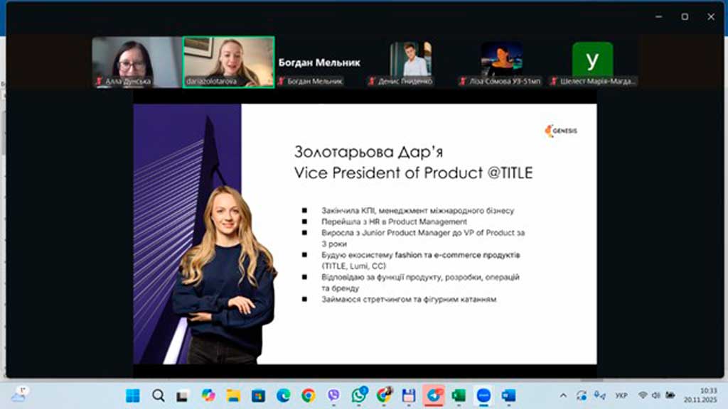 У межах дисципліни «Управління міжнародними проєктами» відбулася надзвичайно надихаюча зустріч зі спікеркою світового рівня — Дарʼєю Золотарьовою, яка будує екосистему fashion та e-commerce продуктів у Genesis та керує міжнародними командами у декількох часових зонах.